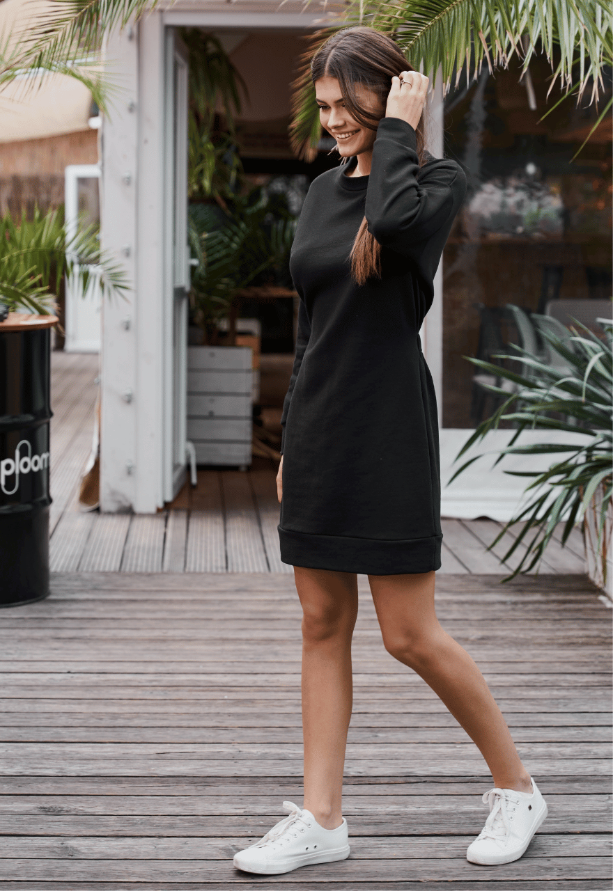 Sukienka przed kolano z dzianiny dresowej w kolorze czarnym.