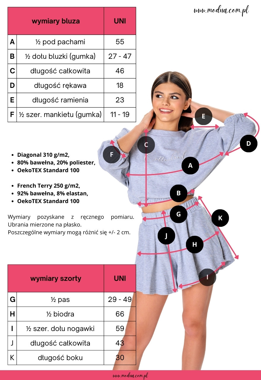 Ubrania mierzone na płasko. Poszczególne wymiary mogą różnić się +/- 2 cm