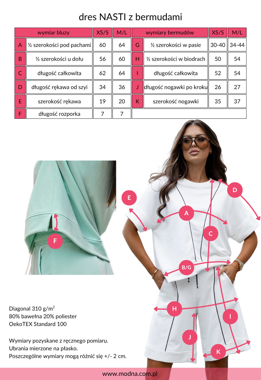 Całość została uszyta z wysokiej jakości bawełny z dodatkiem poliestru. Materiał jest przewiewny, elastyczny i przyjemny w dotyku. To dres na lato, który wygląda równie dobrze z adidasami i plecakiem, jak i z sandałkami i mini torebką. Jeśli lubisz modę, ale cenisz wygodę – to zestaw stworzony właśnie dla Ciebie.