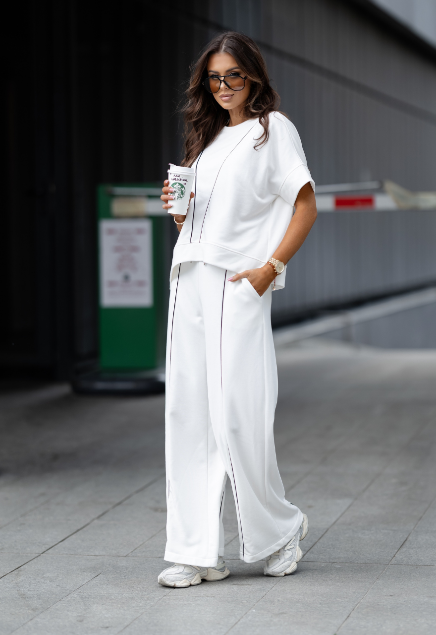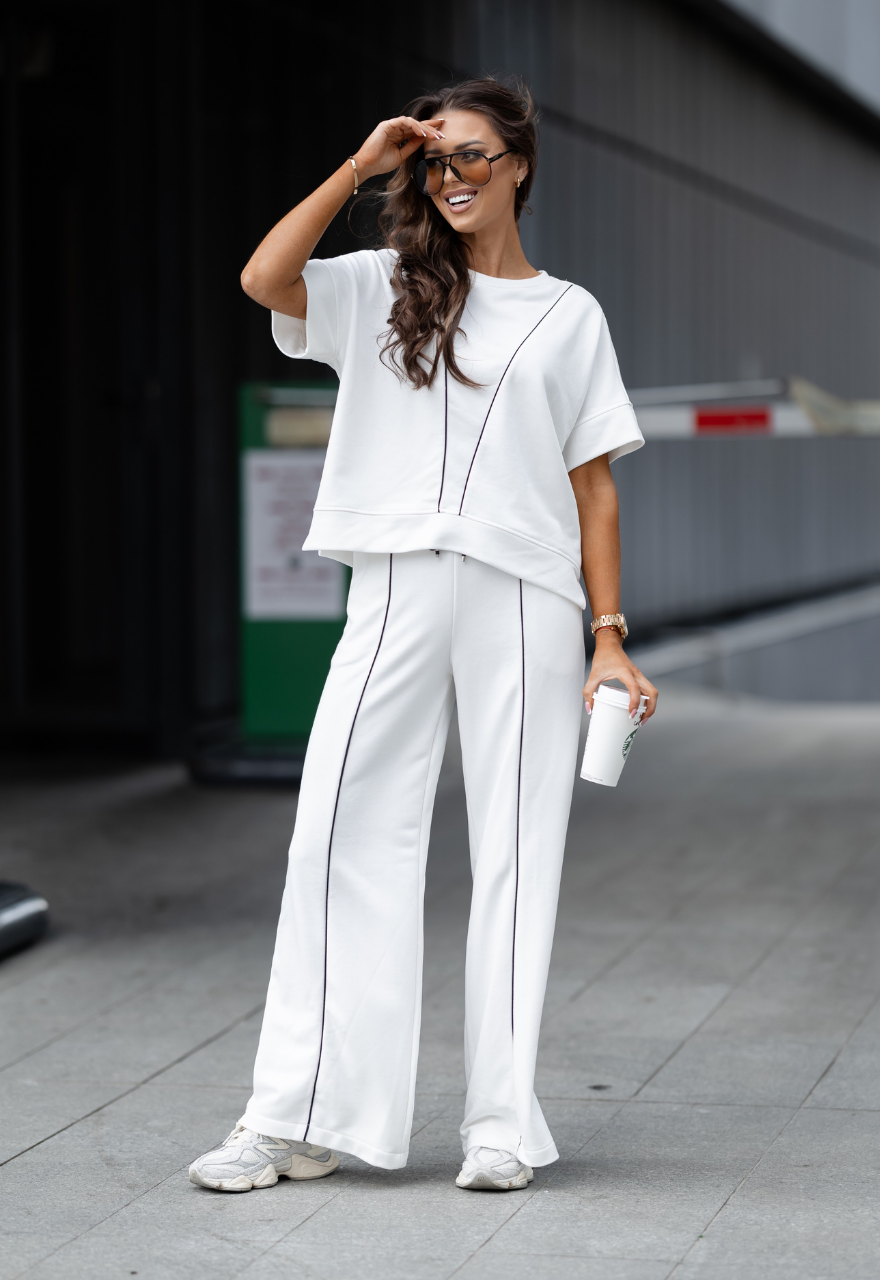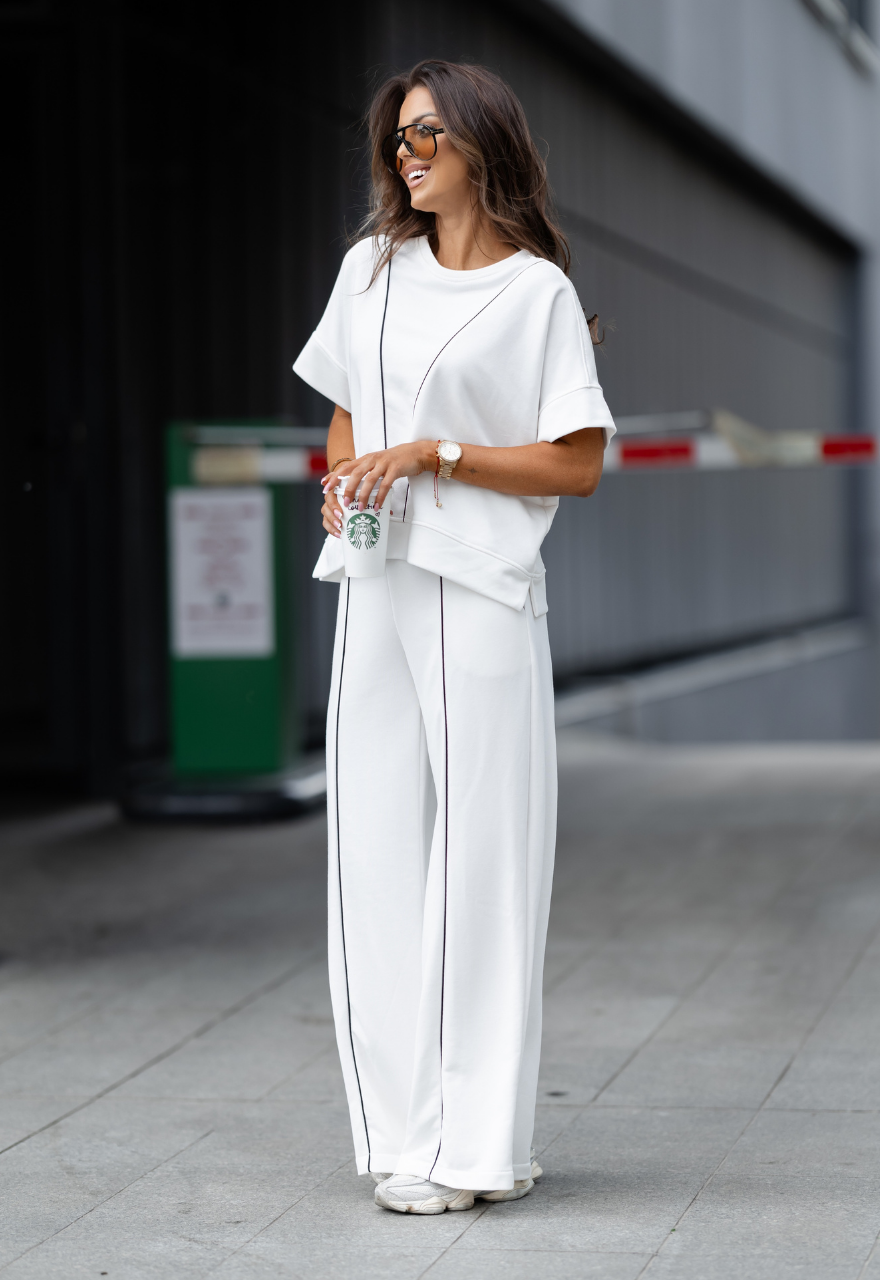 Ten białym dres to kwintesencja wygody i stylu w letnim wydaniu. Komplet tworzy oversize’owa bluza z krótkim rękawem i subtelnymi rozcięciami po bokach oraz spodnie z szeroką nogawką typu szwedy. Spodnie mają elastyczną gumką w pasie i praktyczne ściągacze. Charakteru nadają mu dekoracyjne czarne lamówki, które nie tylko przyciągają wzrok, ale również optycznie modelują sylwetkę i podkreślają talię.