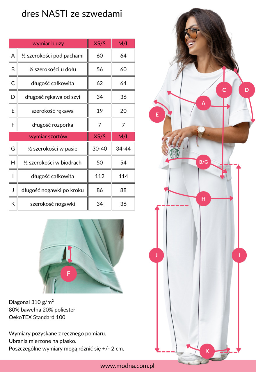Ten miętowy dres to kwintesencja wygody i stylu w letnim wydaniu. Komplet tworzy oversize’owa bluza z krótkim rękawem i subtelnymi rozcięciami po bokach oraz spodnie z szeroką nogawką typu szwedy. Spodnie mają elastyczną gumką w pasie i praktyczne ściągacze. Charakteru nadają mu dekoracyjne białe lamówki, które nie tylko przyciągają wzrok, ale również optycznie modelują sylwetkę i podkreślają talię.