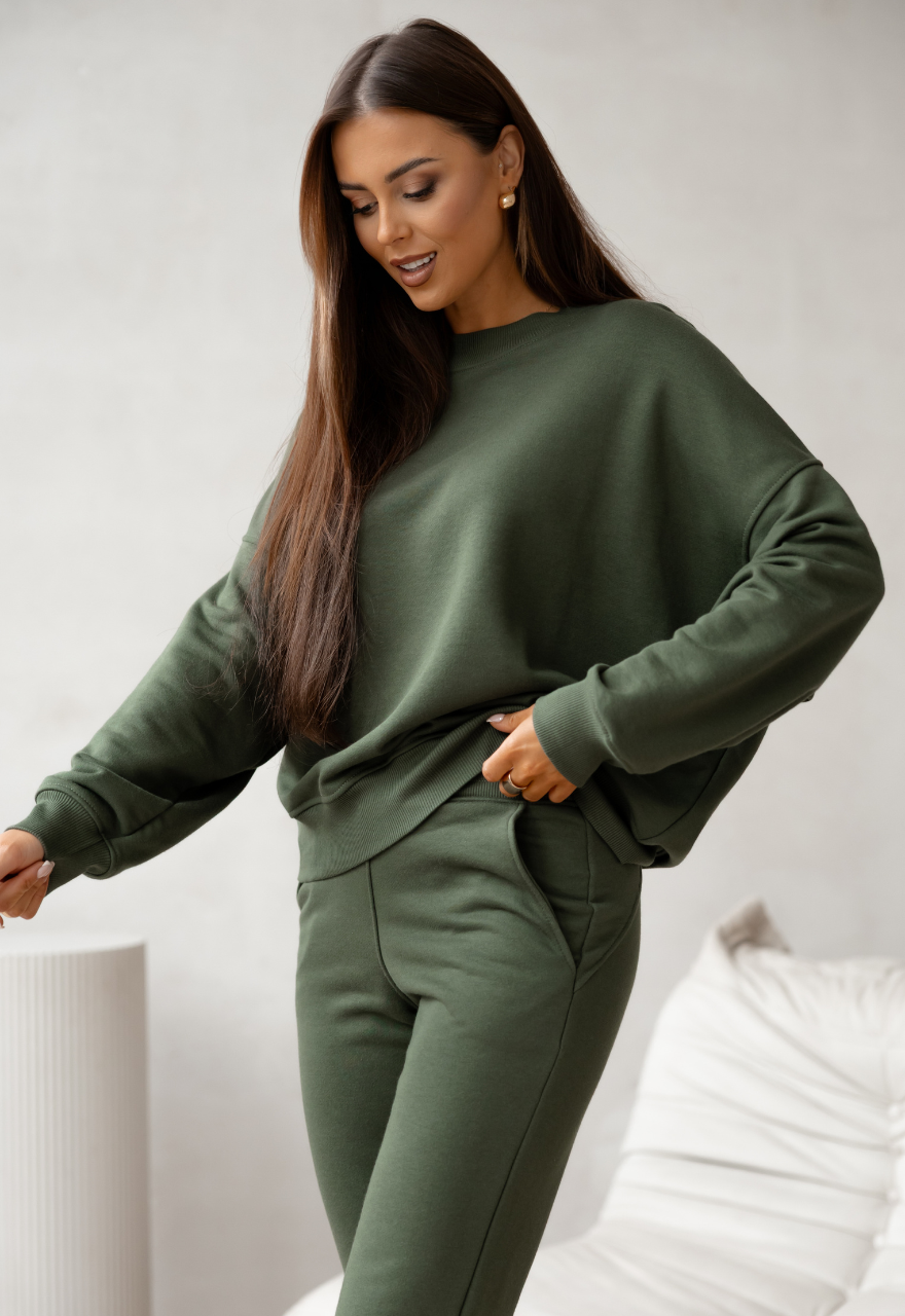 Komplet dresowy COMFY KHAKI polskiej marki Cottonland to zestaw, na który składają się luźna bluza i spodnie ze zgrabnym przeszyciem na pośladkach.