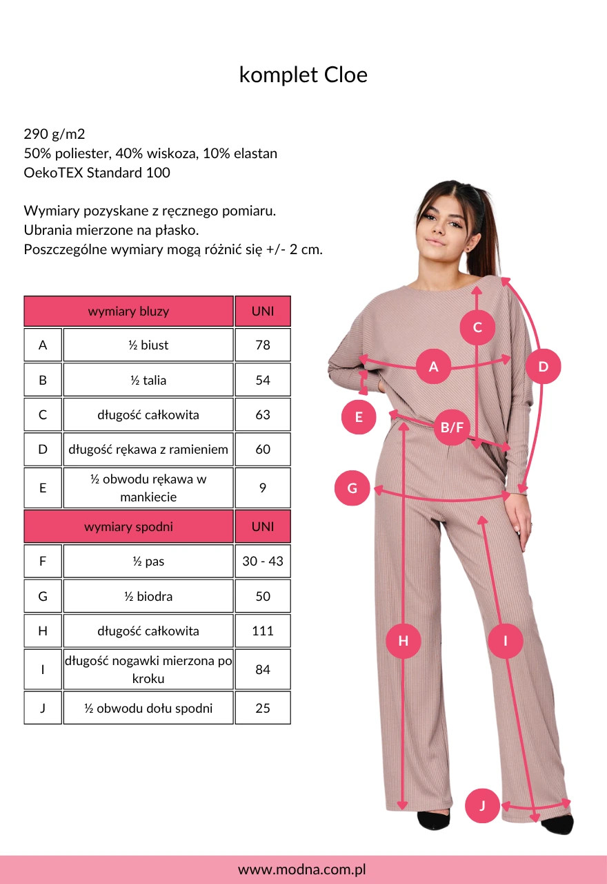 Ubrania mierzone na płasko. Poszczególne wymiary mogą różnić się +/- 2 cm