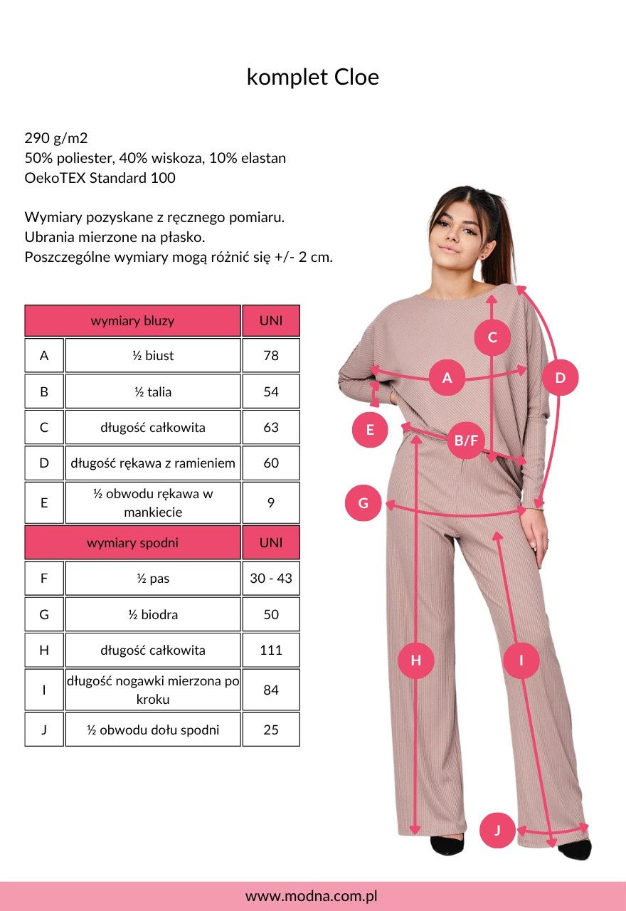 Dzięki rozmiarowi uniwersalnemu (UNI) komplet damski świetnie sprawdzi się dla kobiet noszących rozmiary od S do L. To eleganckie i stylowe rozwiązanie dla kobiet, które chcą wyglądać modnie, ale nie rezygnują z komfortu.