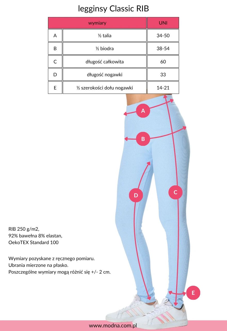 Prążkowany, mocno elastyczny materiał dopasowuje się do kształtu ciała, gwarantując pełną swobodę ruchu i nieskrępowaną wygodę przez cały dzień. Legginsy w rozmiarze UNI (S–L) pasują na różne sylwetki, co czyni je niezwykle praktycznym wyborem.
